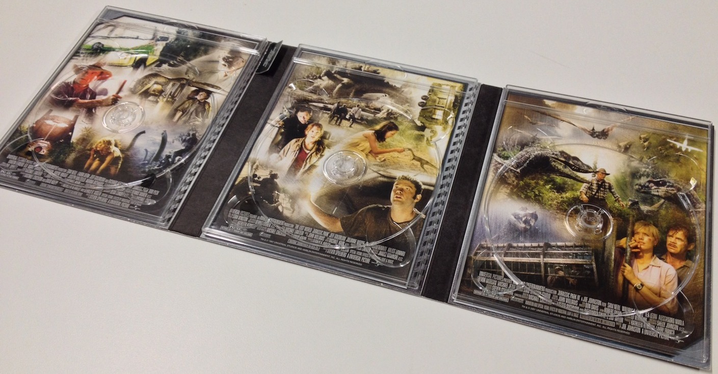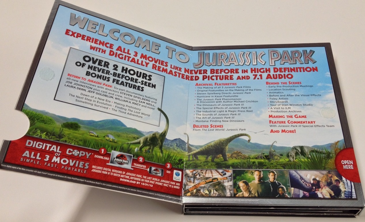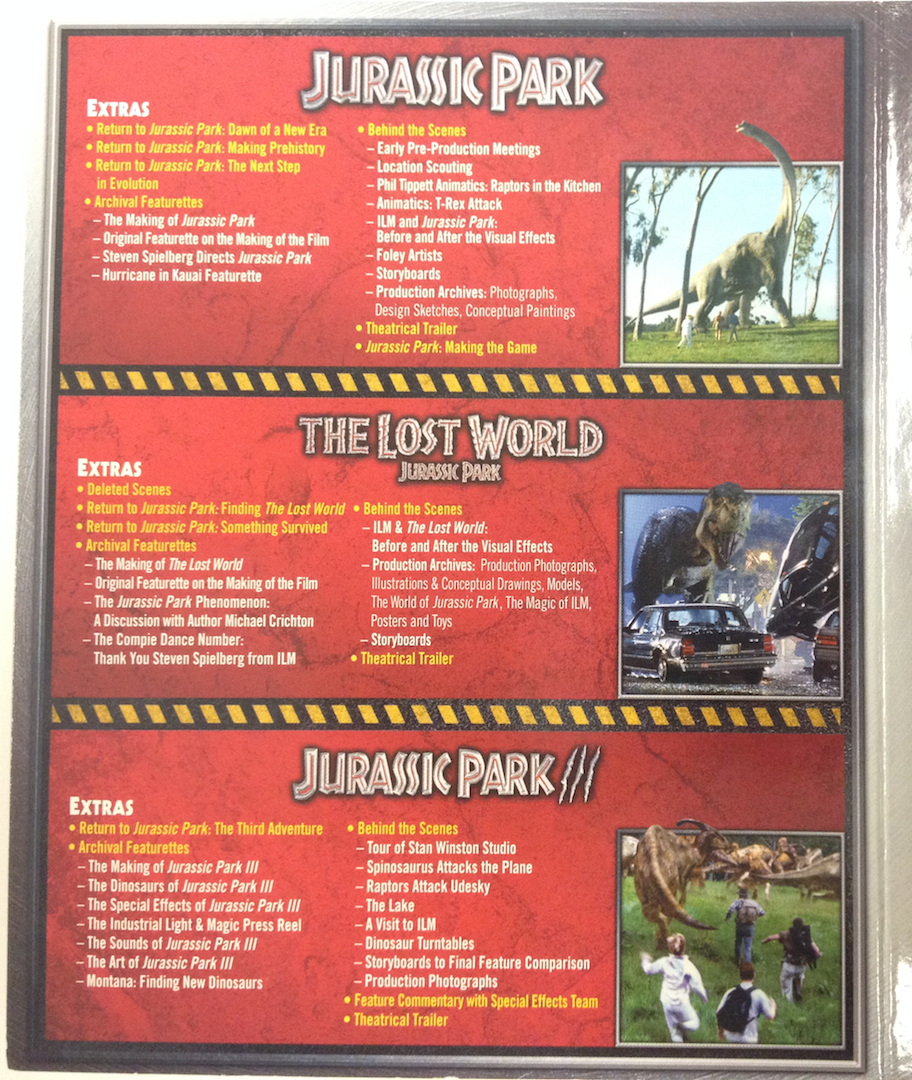 With the recent announcement of the fourth upcoming entry, Jurassic World which comes out in 2015, it seems to be most timely to cover this excellent trilogy’s box set. This set came out in 2011 in two editions: a blu ray box set and a limited edition with a T-Rex mini statue. I had to settle for the first. Like most movie nerds my age, I feel that Jurassic Park is a staple of american cinema and one of my favorites growing up and still is to this day. When this trilogy was released, I got so excited that I made sure to get the day off from work and I spent the day watching all three back to back to back. So now we ask, does the blu ray remastering make that much of a difference compared to with its DVD counterpart?
